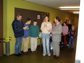 Die Geschäftsführung der "Firma für alles Mögliche" übergibt dem Schulleiter Herrn Hilfer und dem Hausmeister Herrn Bleeker 90 Energiesparlampen.