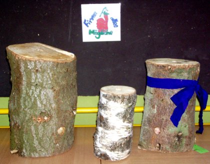 Die größeren Holzöfen sind aus Nadelhölzern. Sie haben Durchmesser von 28 - 35 cm und eine Höhe von 40 - 45 cm. Sie brennen über drei Stunden. Preis: 8,00 € - 10,00 € |