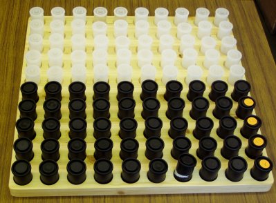 Diese Hundertertafel liefern wir in den Maßen 50 x 50 cm. Die Löcher haben einen Durchmesser von 3,5 cm und eignen sich für normale Filmdosen. Die Filmdosen müssen jeweils selber besorgt werden. Die Preise richten sich nach der Holzart (Kiefer, Buche)