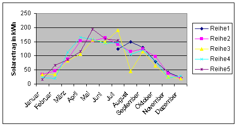 Diese Tabelle zeigt die monatlichen Erträge der Fotovoltaikanlage. Für die Darstellung des Solarertrags habe ich jetzt ein anderes Diagrammformat gewählt. Ich Denke mit einer Fieberkurve lässt sich ein Verlauf über das Jahr hinweg besser darstellen. Wie an der Kurve für 2007 zu sehen ist, hat sich der negative Trent aus 2006 nicht fortgesetzt. Im Februar wurden die Kollektoren ausgetauscht, daher ist hier der Ertrag noch unter denen anderer Jahre. Aber in den darauf folgenden Monaten lag der Ertrag immer über dem der vergangenen Jahre und wir können auf den Jahresabschluss gespannt sein. Grund genug noch mehr für den Klimaschutz zu tun. Wir bleiben dran. |