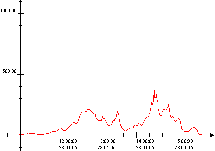 Ein trüber Tag im Januar Erst um 11.00 Uhr sind die ersten Werte auf der Anzeige zu sehen. Die Stromproduktion liegt den ganzen Tag unter 400 W pro Stunde. Schon um 15.40 Uhr zeigt unsere Anzeige nichts mehr an.