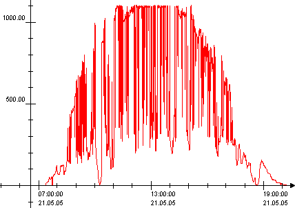 Ein sonniger Tag im Mai Bereits 7.20 erzeugt unsere Anlage den ersten Strom. Von 10.00 bis 15.00 Uhr werden immer wieder Werte von bis zu 1100 Watt erreicht. Erst gegen 20.10 Uhr reicht das Sonnenlicht nicht mehr für die Stromproduktion aus. |