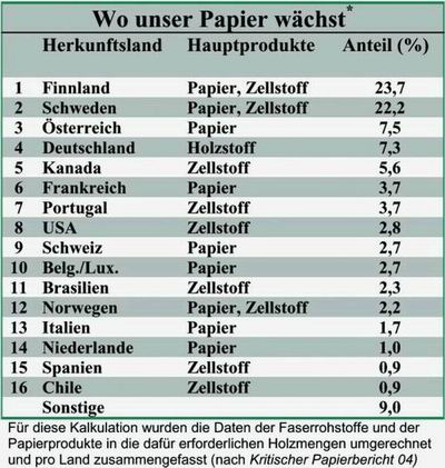 Leider wird aus der Tabelle die wahre Herkunft unseres Papiers nicht deutlich. Finnland als größter Lieferant für unser Papier bezieht sein Holz zu einem großen Teil aus Russland und ist somit an der Zerstörung der sibirischen Taiga mitverantwortlich. Zellstoff wird für die finnische Papierindustrie auch auf Sumatra produziert. Damit ist die finnische Papierindustrie auch mit für das Abholzen der südostasiatischen Regenwälder und der schlechten Lebensbedingungen der Landbevölkerung auf Sumatra verantwortlich.